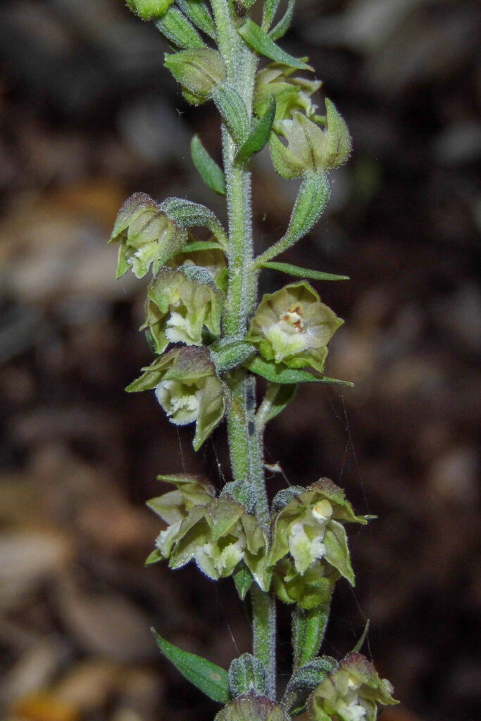 Pianta alta fino a 50 cm, generalmente singola o a coppie, raramente cespitosa; scapo esile e flessuoso, verde glauco, decisamente pubescente e grigiastro soprattutto nella parte superiore; 2-9 foglie molto piccole (2,5-5 × 0,5-2,5 cm), ±strettamente lanceolate, verdi-grigiastre, a volte con sfumature violacee; brattee strette, lanceolate, pubescenti, grigiastre. Infiorescenza lassa, lunga 4-22 cm, subunilaterale, con 4-15(30) fiori piccoli, odorosi, spesso semiaperti, penduli e campanulati, esternamente grigio-verdastri. Tepali ovato-lanceolati (5-8 × 2-5 mm), carenati, esternamente pubescenti, internamente bianco-verdastri, i petali spesso con sfumature rosee. Labello con giunzione ipo-epichilo a V; ipochilo a coppa, nettarifero, biancastro, internamente verde-olivastro; epichilo bianco-verdastro, cordato (2,5-4 × 2,5-4 mm), a margine crenulato, con vistosa increspatura rugosa alla base spesso prolungata fin quasi all’apice; colonna corta e tozza, clinandrio ben sviluppato, viscidio inefficace dopo breve tempo; pollinii inizialmente compatti, poi sfarinantesi sullo stigma quadrangolare; ovario pubescente, piriforme, piccolo ma notevolmente ingrossato a maturazione, con breve pedicello pubescente e violaceo. Numero cromosomico: 2n = 32, 40.
