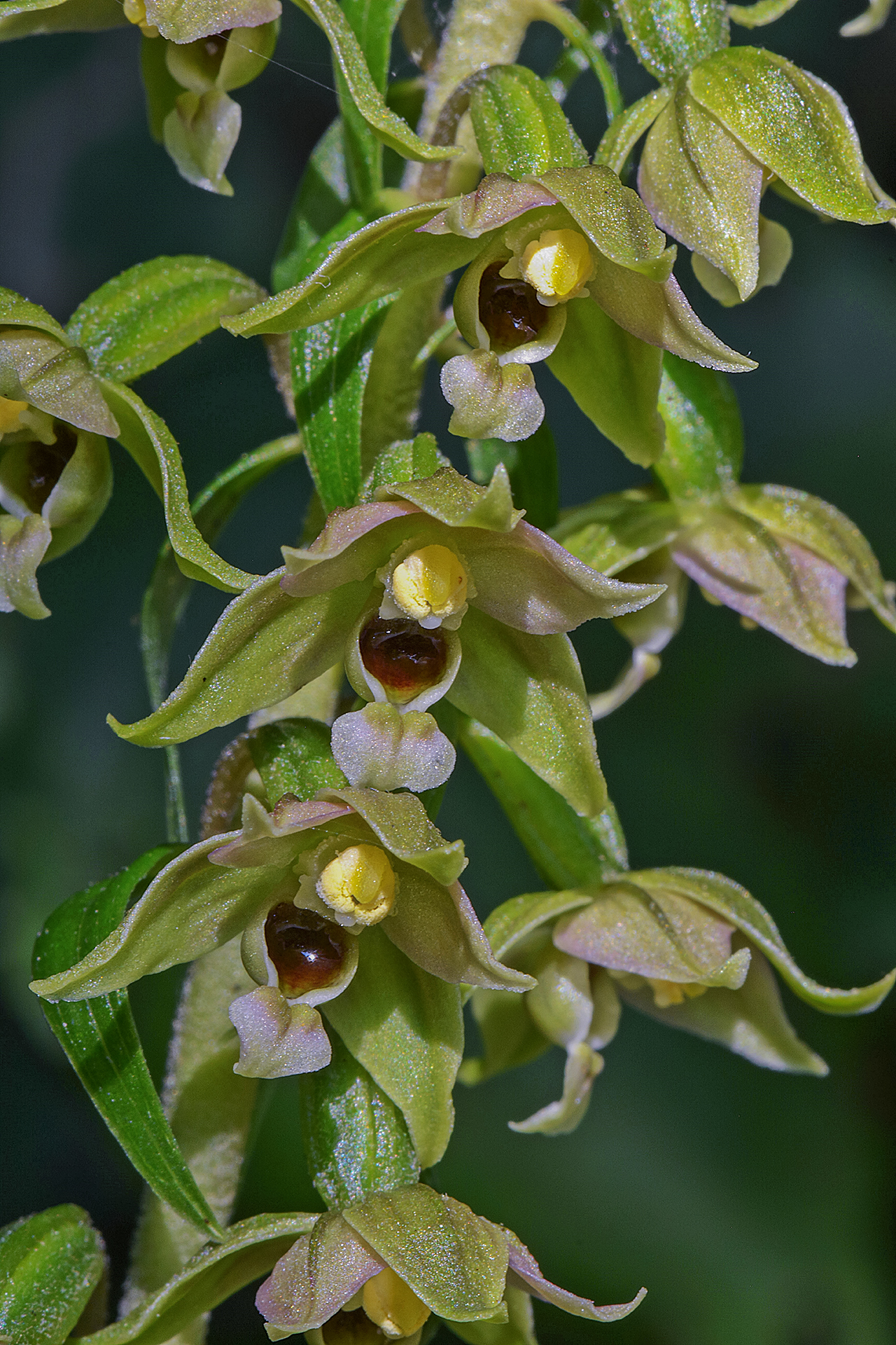 Caratteri essenziali distintivi rispetto a E. helleborine: pianta verde (non arrossata), solitamente con singolo scapo rigido (raramente cespitosa), alto 25-60(70) cm, con 4-6 foglie con bordi irregolarmente papilloso-denticolati, le inferiori piccole e lungamente guainanti, le mediane ovato-subrotonde (3,2-5 × 2-3,6 cm), ottuse e spesso più corte degli internodi, da eretto-divaricate a patenti, le superiori lanceolate e acute; brattee lineari-lanceolate, le inferiori più lunghe dei fiori (fino a 6 cm). Infiorescenza densa, lunga fino a 25 cm con 14-30(45) fiori aperti e obliqui, predisposti per l’allogamia. Sepali ovato-lanceolati (9,5-11 × 5,5-6,5 mm), acuti, verdi con sfumature violacee; petali ovati, verdi con sfumature rosee; labello con giunzione ipo-epichilo corta e larga; ipochilo (4,5-5 × 5-5.5 mm), internamente bruno-violaceo e con bordi rosei; epichilo (4-4,2 × 5-6 mm) in gran parte ripiegato all’indietro, roseo al centro, bianco-rosato ai lati, ad apice verdastro e diverse callosità rosate plicate longitudinalmente; rostello presente; viscidio efficace; ovario pedicellato, subclavato, leggermente pubescentee.