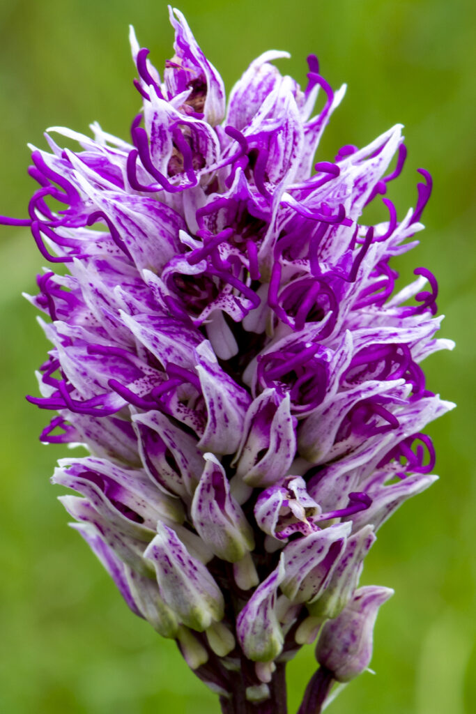 Infiorescenza densa e multiflora, da ovoide a cilindrica, con un gran numero di grandi fiori (anche oltre un centinaio per pianta). Sepali ovati (8-13 × 4-6 mm), concavi, brevemente acuti (di rado ottusi); petali lineari-lanceolati, lunghi 5-8 mm, da violetti a biancastri, nascosti sotto il casco esternamente porporino scuro con striature e macchie molto evidenti, internamente più chiaro e meno punteggiato. Labello pendulo o appena proteso in avanti (9-20 × 11-22 mm), di solito biancastro a margini rossastri, cosparso di ciuffi di peli papillosi porporini; lobo mediano che si allarga dalla base verso l’apice, dove si divide in due lobuli tozzi e larghi, separati da un dentino di solito evidente; i 4 lobi sono divergenti verso l’esterno e di larghezza variabile, ma i laterali sempre più stretti dei lobuli centrali; sperone roseo, lungo 3-8 mm, arcuato in basso e piuttosto sottile, un po’ rigonfio all’apice; ovario verde chiaro con sfumature violacee, capsula oblunga con coste pronunciate. Impollinata da imenotteri (Apis, Halictus, Andrena) e da coleotteri.