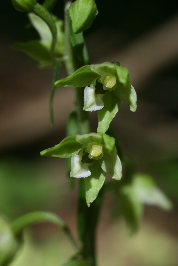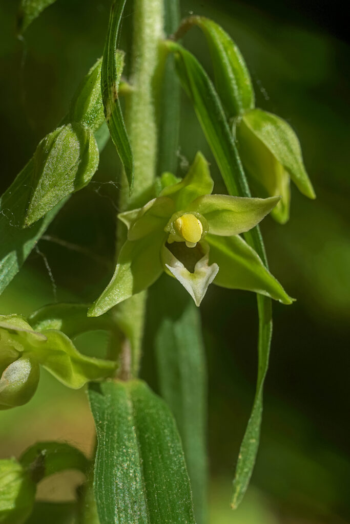 Caratteri essenziali distintivi rispetto a E. helleborine: pianta cespitosa (fino a 10 scapi insieme), quasi interamente verde, solitamente molto alta (fino a più di 1 m); scapi slanciati, sottili e flessuosi, quasi glabri verso la base (appena rosata), pelosi in alto; 6-10 foglie spiralate, le inferiori molto piccole, assai in alto rispetto al suolo e lungamente guainanti; le intermedie da lanceolate a ovato-lanceolate (3-12 × 2-4 cm), molli, di solito arcuate verso basso; le superiori bratteiformi allungate; brattee strette, le inferiori lunghe fino a 3 cm. Infiorescenza lassa, unilaterale, con 10-40 fiori piccoli, generalmente aperti, allogami almeno a inizio fioritura, poi all’occorrenza autogami. Tepali ovato-lanceolati, i sepali 7 × 3-4 mm, di color verde chiaro con margini a volte rosati; petali esternamente verde-rosati, internamente da biancastri a rosei. Labello con giunzione ipo-epichilo larga; ipochilo emisferico, verde-rossastro o bruno-rossastro all’interno; epichilo lungo come largo (4 × 4 mm), a bordi crenulati, biancastro, al centro con sfumature verdi o rosee, con callosità basali verdi, arrossate o brunastre; viscidio efficace per qualche tempo; pollinii granulosi, prima coerenti, poi friabili; ovario verde, fusiforme, con pedicello lungo, verde o roseo-violaceo.