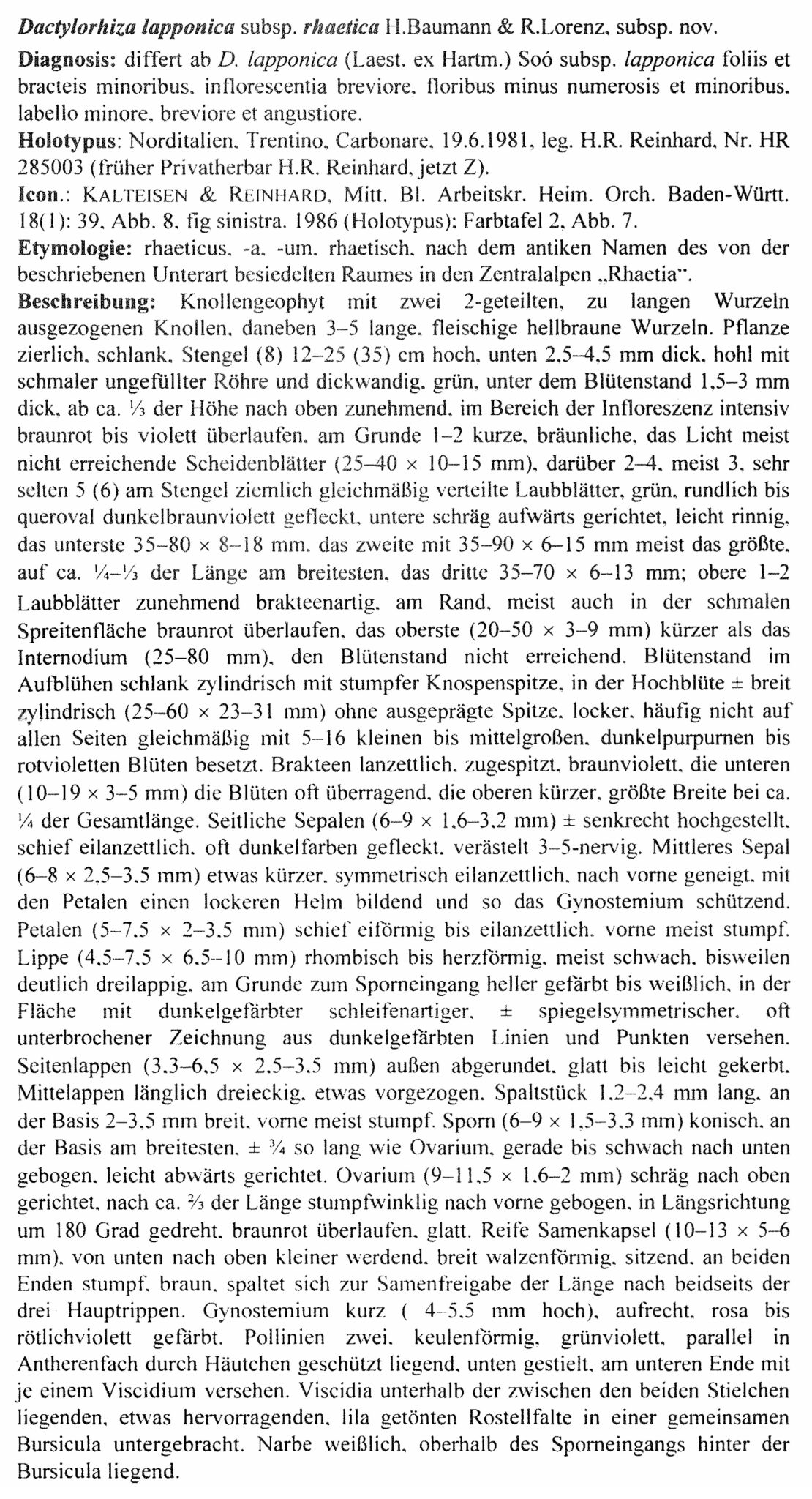 Protologo di Helmut Baumann e Richard Lorenz 2005 (Dactylorhiza lapponica subsp. rhaetica):