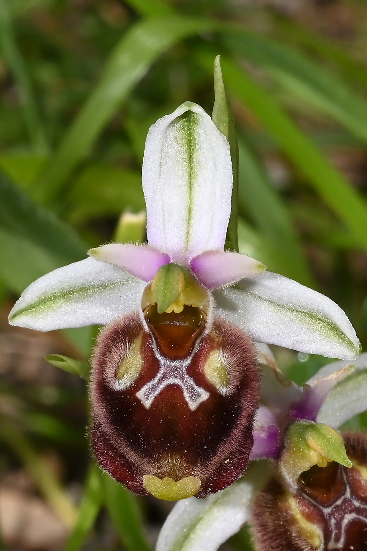 Pianta slanciata e abbastanza robusta (oltre i 30 cm di altezza), infiorescenza con 2-7 fiori medio-grandi. Tepali biancastri o verdastri, a volte con sfumature rosee, i sepali oblunghi-lanceolati (12-15,5 × 6,5-8,5 mm), i petali strettamente triangolari-lanceolati (4-7 × 2-4 mm), concolori o più giallastri. Labello ampio, da trapezoidale a suborbicolare (10-15 × 13-19 mm), da convesso a subgloboso, bruno-rossiccio; densa pelosità marginale in prevalenza fulva; gibbosità piccole ma evidenti, con lunga pelosità esterna e peluria più corta e rada nella faccia interna; macula in posizione basale, ridotta e semplice a forma di H grossolana, di rado più elaborata, di colore bruno scuro con bordo chiaro; campo basale bruno-verdastro, ampio e ben delimitato dalla macula, cavità stigmatica larga e bassa con pseudo-occhi rotondi o ellittici; apicolo evidente ma non troppo grosso, giallastro, rivolto in alto o in avanti obliquamente. Impollinata da Eucera nigrescens.