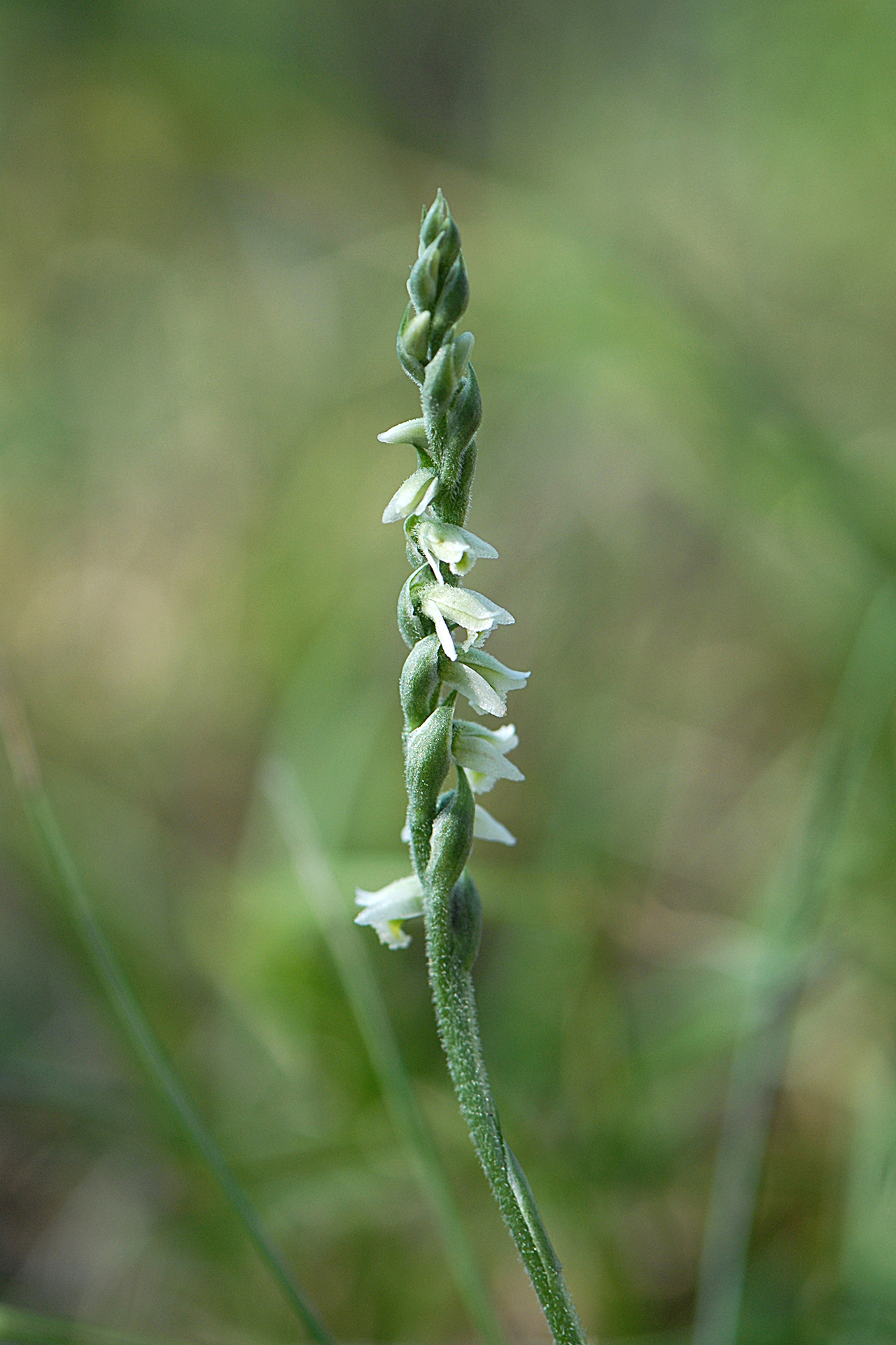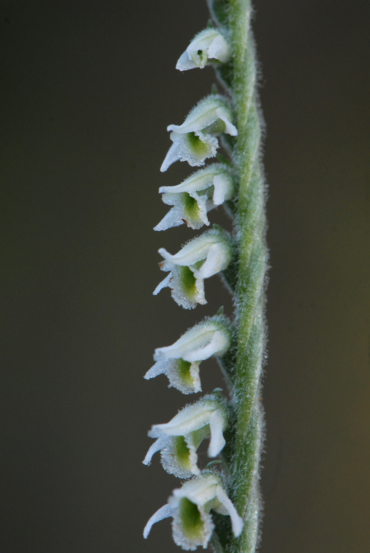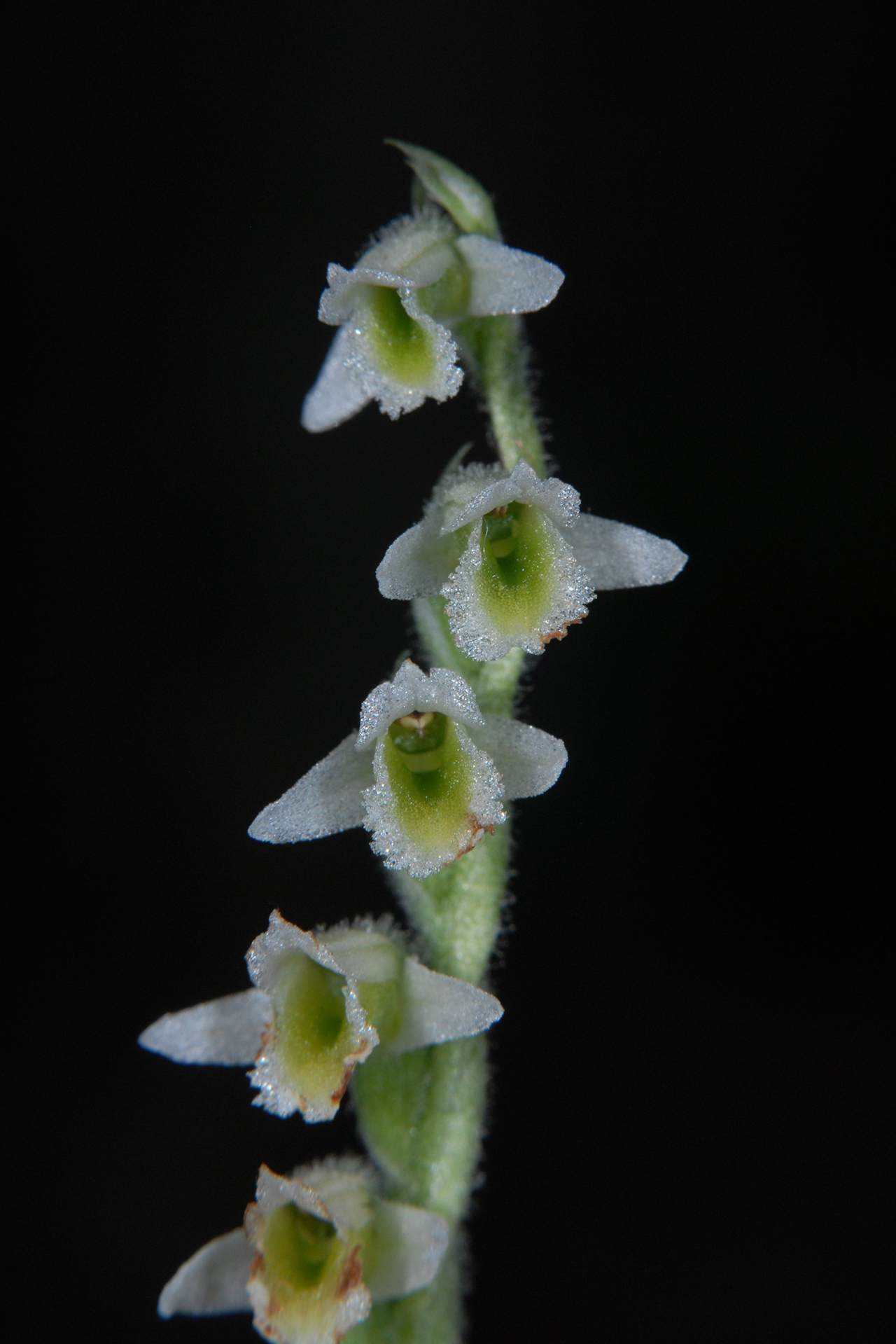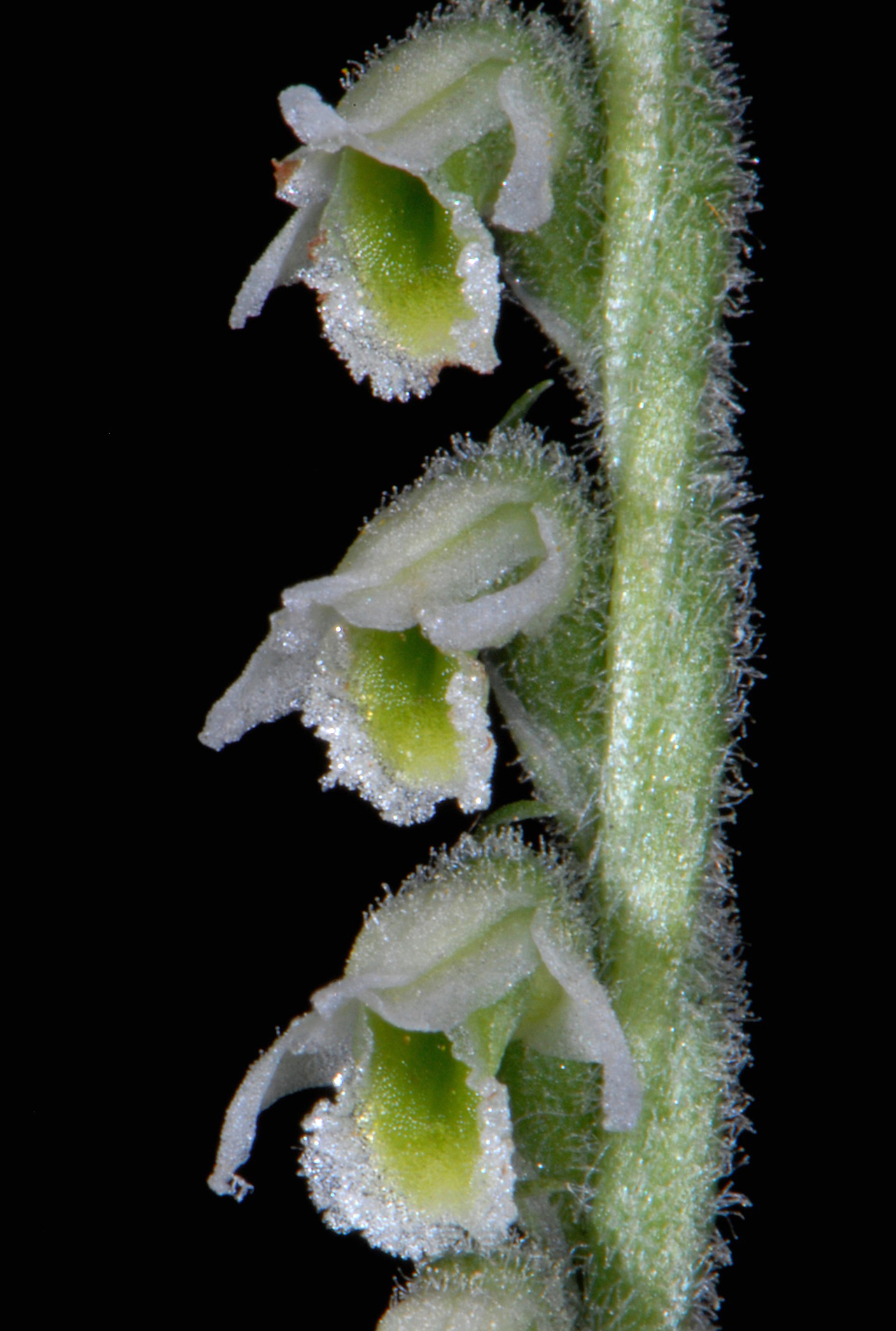 Infiorescenza lunga 3-15 cm, con 6-30 fiori bianco-verdastri pubescenti, disposti in spirale piuttosto densa e profumati. Tubo tepalico campanulato lungo 5-7 mm, dilatato alla fauce, con sepali e petali subeguali, subtriangolari, stretti, allungati e ottusi; labello intero, bianco ma internamente verdastro, 5-8 × 4 mm, con 2 nettarii alla base, e nella parte terminale ripiegato verso il basso e a margine crenulato; ovario eretto, appressato allo scapo.