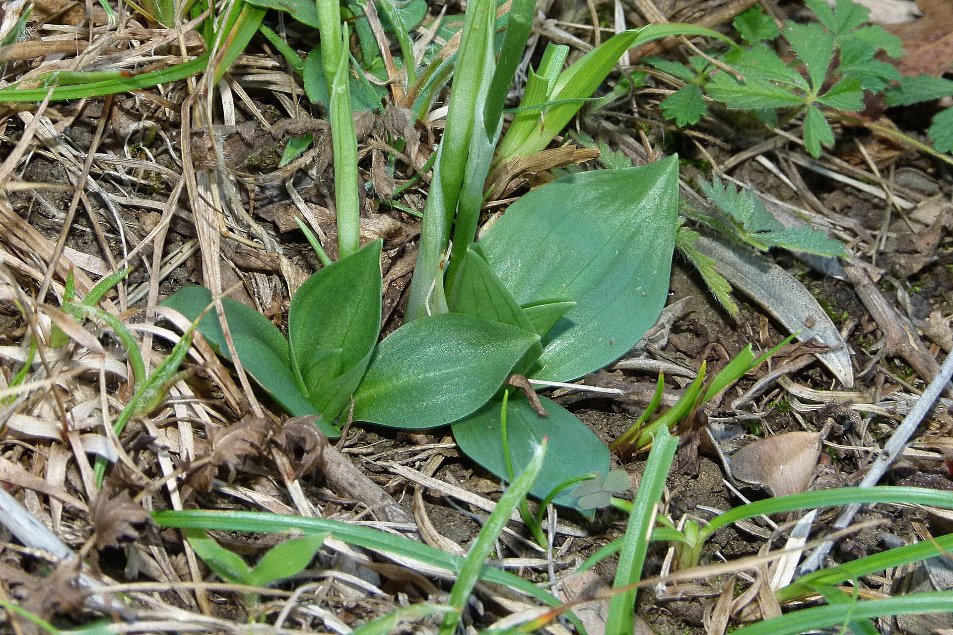 Scapo pubescente disposto lateralmente rispetto alla rosetta di 3-7 foglie basali, alto 15-35 cm, sottile, verde-grigiastro; foglie basali lucide, distese, largamente ovato-ellittiche (2-3,5 × 2 cm), acute e subsessili, completamente sviluppate soltanto dopo la fioritura; 1-3 foglie cauline piccole e bratteiformi; brattee esternamente pubescenti, poco più lunghe dell’ovario.